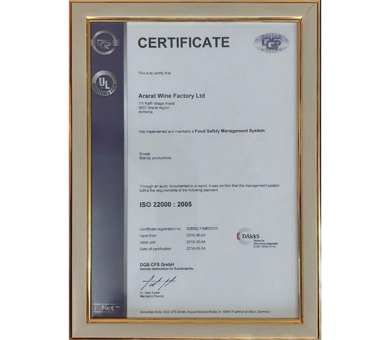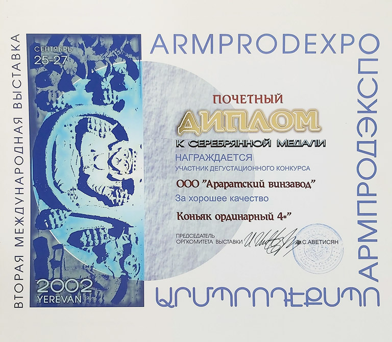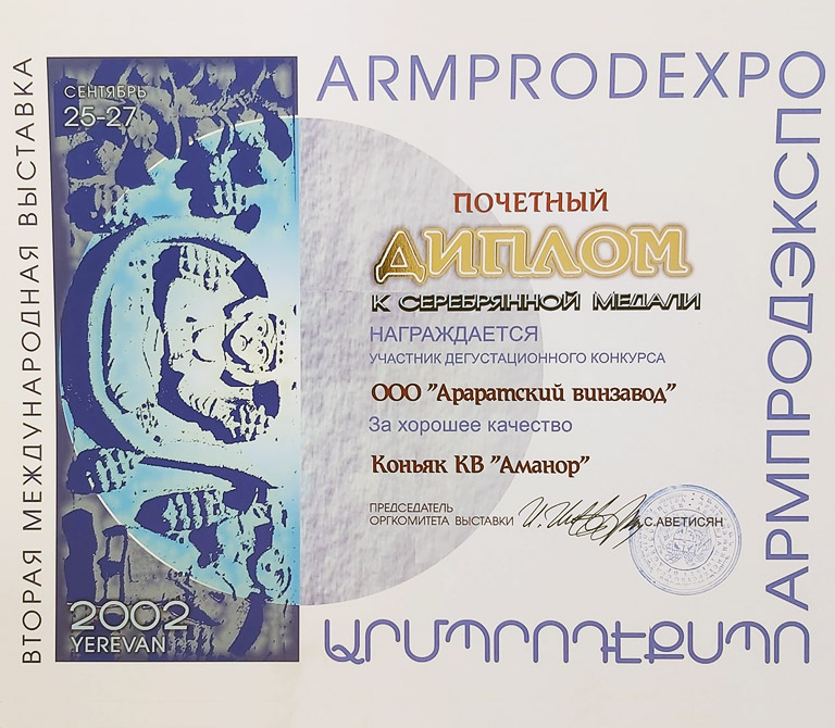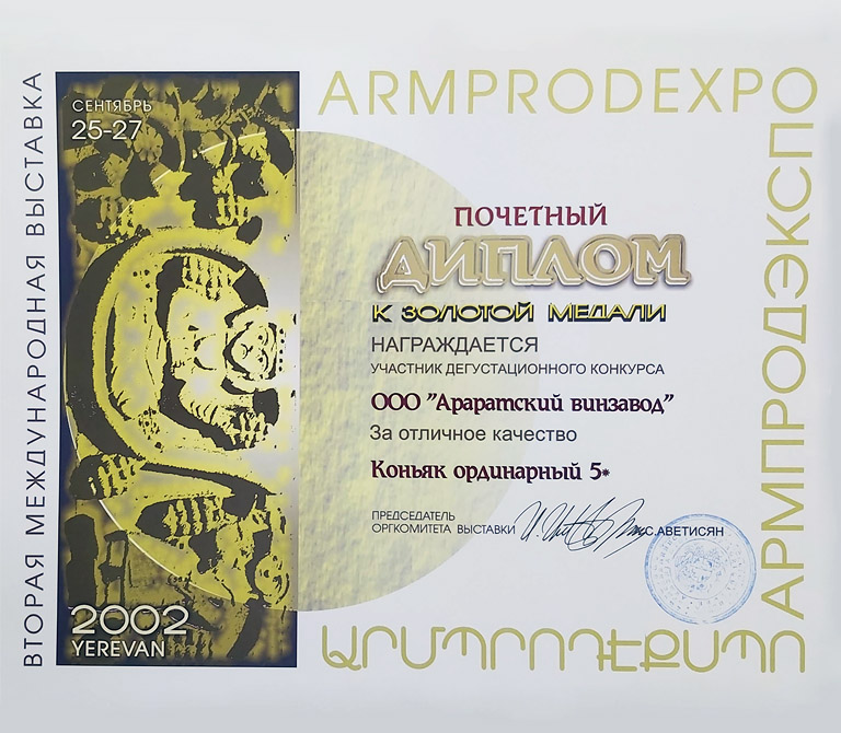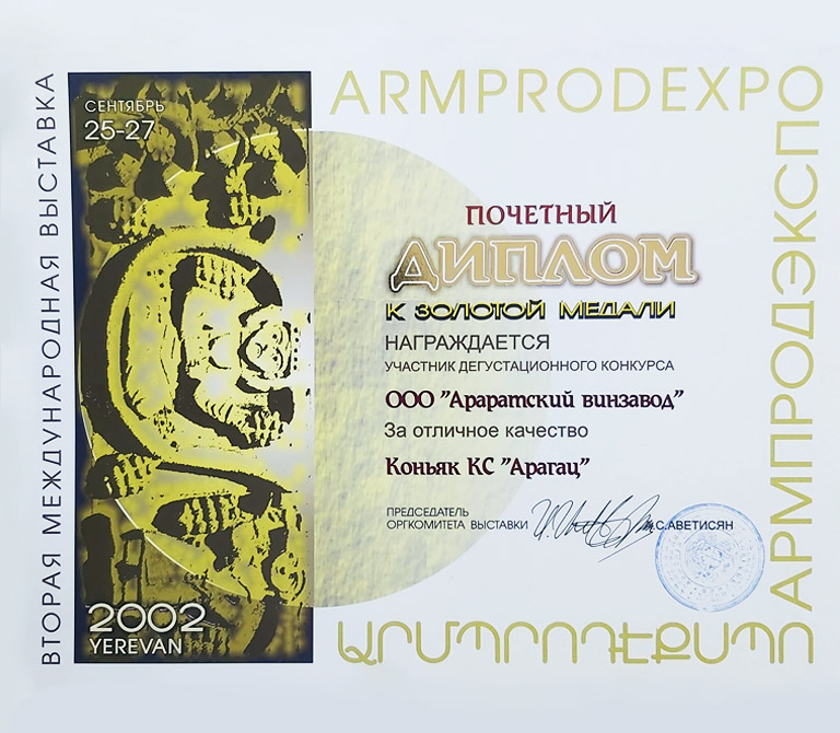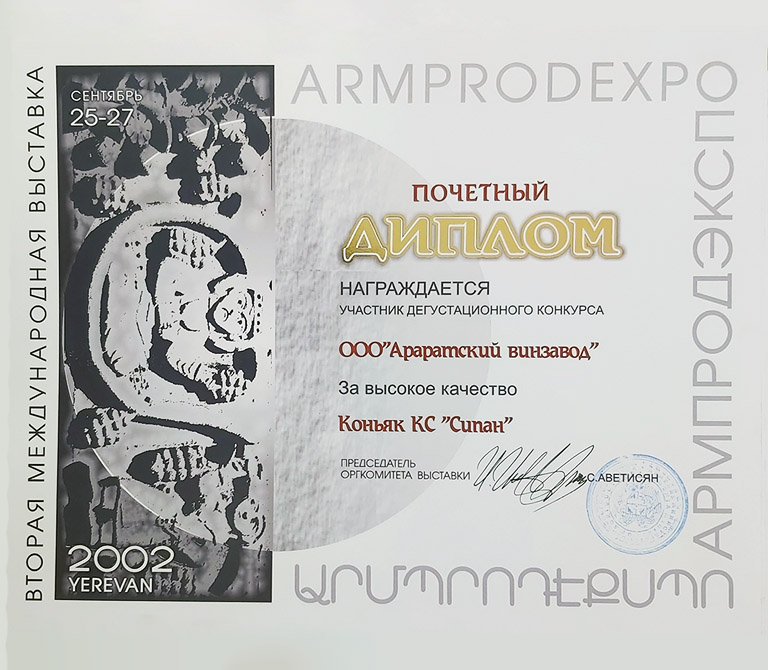 Մեր գործարանն արժանացել է բազմաթիվ մրցանակների և ոսկե մեդալների, այդ թվում «ԱրմՊրոդԷքսպո»-ի կողմից արժանացել է ոսկե և արծաթե մեդալների, «Սիփան» և «Ordinary 3» կոնյակներն արժանացել են պատվոգրերի բարձր որակի համար, «Գրիգոր Լուսավորիչ» 30 տարեկան և «Գեղարդ» 25 տարեկան կոնյակներն արժանացել են մեծ ոսկե մեդալի։ Ինչպես նաև կայուն բարձր որակ ապահովելու համար, գործարանին շնորհվել է «Ադամանդե աչք» կոչվող մրցանակը։